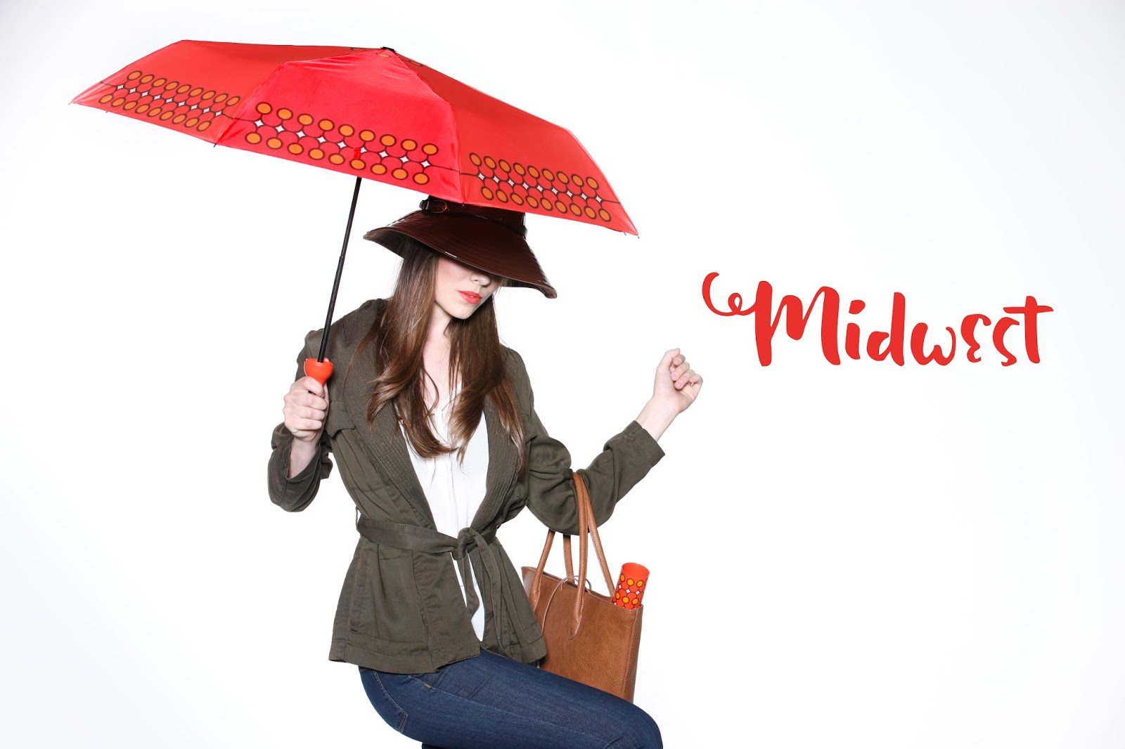 If you're from the midwest, you LOVE fall. You look forward to the layers, the denim and the cool dark colors. But you also love the bright leaves as they turn from green to red. This is the perfect fall outfit because it's nice and casual, but still work appropriate. You chose the red Deco design, along with your red lipstick, because it complements the earthy tones of your fall jacket and jeans. Throw on a brown rain hat for extra hair protection and you're good to go.