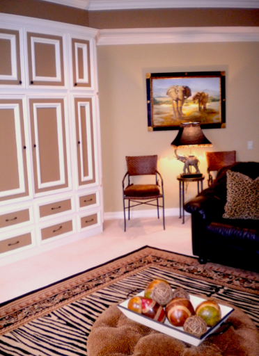 Vinrella owner, Sheri Hammonds, has her own “woman cave” filled with animal prints, and it’s quite the Safari room. It all began with a few black leather couches and some leopard drapes. Then, morphed into this: