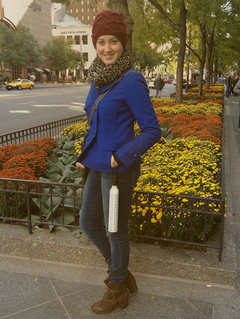 Well, here's my story. The White geometric design I'm carrying above is one of my favorites because I love the bold patterns that match my graphic designer style. I wear mostly solid bright colors, so the cool pattern compliments my urban chic style. My bottle sits on my desk at work, ready to brave the Windy City whenever I need it. Not to mention that I feel pretty safe walking home with it in hand!